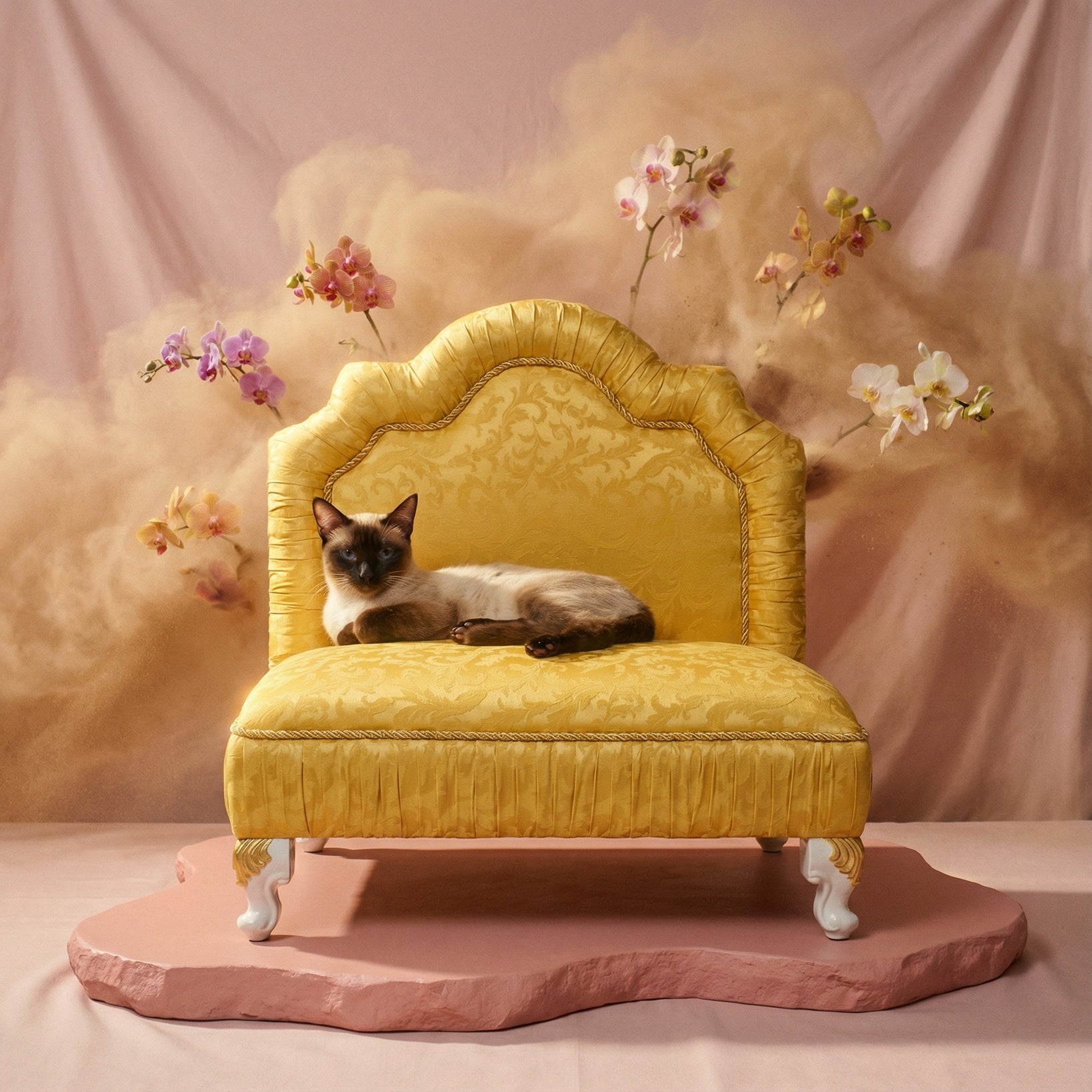 A timeless bed featuring Italian fabrics for your pet’s comfort, finished with legs embellished by hand with genuine 24k Gold Leaf.