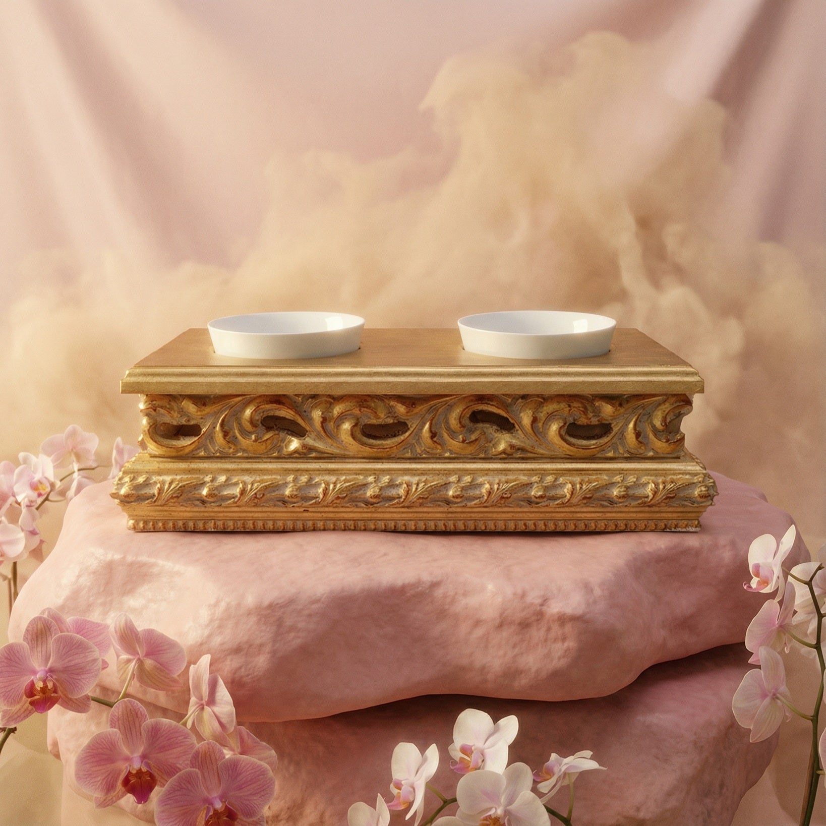 Constructed with hardwearing FSC certified wood and enriched with 24k Gold leaf Italian frame. The Luigi feed stand is painted by hand with Farrow and Ball, and completed with handmade porcelain bowls.